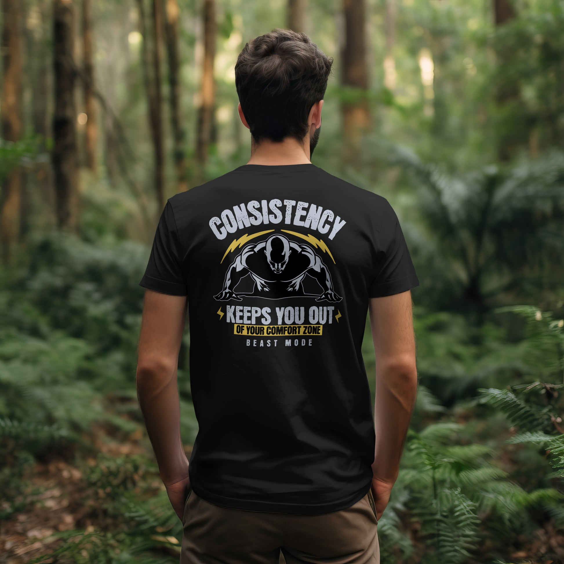 Stay driven with this bold men’s motivational T-shirt that reads: “Consistency Keeps You Out of Your Comfort Zone.” Built for those who show up day after day, this shirt is a reminder that real growth happens when you push past easy and embrace the challenge. Whether you're hitting the gym or chasing goals, wear it as a symbol of discipline, grit, and the power of staying consistent.